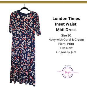 Discover the timeless elegance of the London Times Inset Waist Midi Dress, size 10, crafted in a refined navy hue. This dress features a stunning floral print with intricate coral and cream flowers that beautifully contrast against the deep navy background. Designed for both style and comfort, it has a flattering inset waist and a graceful midi length that suits any occasion. Like new, with impeccable condition, this dress is a versatile addition to your wardrobe, perfect for daytime gatherings or evening events.