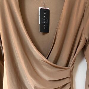 Elegant front wrap long sleeve shirt. Color - Beige or Tan (shiny), Size - Large, Material - Polyester, Brand- 21 Saints