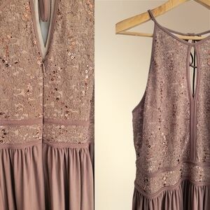 This exquisite taupe/mauve maxi dress boasts a sleeveless halter neckline, ideal for wedding guests or formal occasions. Its flowing silhouette and lightweight fabric ensure both comfort and sophistication. The gown's elegant design makes it a standout choice for any special event. This dress does not have a slit in the skirt but is flowy enough that it does t interfere with walking. 42" from bottom of empire waist band to hem, 58" from collar bone to hem, waist is 37" with some stretch.