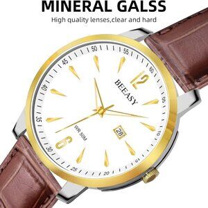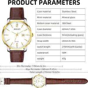 Features: Classic analog design with Japanese quartz movement, featuring a sleek leather band. The minimalist aesthetic makes it perfect for dressing up a business look or adding a sophisticated touch to casual wear. Large, easy-to-read face with day and date display, and a durable 5ATM waterproof build for everyday wear, including showering or swimming (avoid pressing buttons under water). The soft leather strap ensures comfort and easy adjustment. Includes a tang buckle for secure wear.