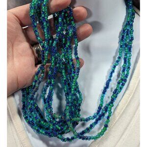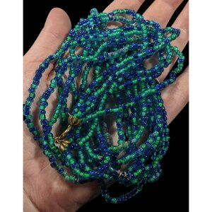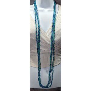 Elegant multilayer opera necklace with a mermaidcore aesthetic, featuring vibrant blue and green glass beads. Perfect for adding a touch of fantasy to any outfit.