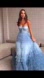 Milla Strapless frill-layered evening tulle sky blue dress. Features a semi-transparent corset with built-in cups, frill-layered maxi skirt, and the train.
