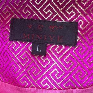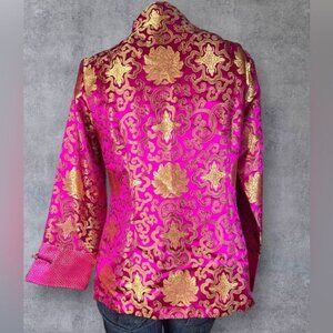 Step out in style with this vibrant Miniye brocade jacket. The luxurious pink and gold pattern exudes sophistication, while the high-collar and traditional fastenings add a touch of elegance. Perfect for any special occasion or as a statement piece to elevate your everyday look.
