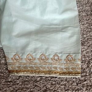 Stylish mint green tunic featuring intricate gold embroidery and accents. Perfect for special occasions.for 5/6 girl. From Palistani designer beechtree. Perfect for Eid and Ramadan. Worn for some hours