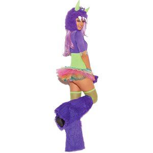 Elegant Moments One eyed monster - 2 pc. Costume includes tutu dress and furry monster hood with one eye. DOES NOT INCLUDE STOCKINGS OR BOOT COVERS Neon Green/Purple Fabric: 92% Polyester/8% Elasthan
