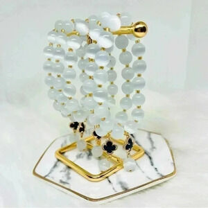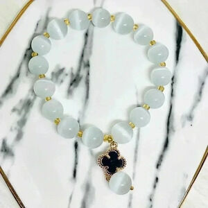 As enchanting as the night sky, this Elegant Moonstone Four-Leaf Clover Bracelet will make you feel graceful and glamorous. Finished with an icy white moonstone, 10mm beads, and a two-inch diameter, this bracelet is as elegant as it is comfortable, with its elasticity fit for most wrists. Add the perfect touch of luck with its beautiful four-leaf clover charm.