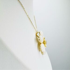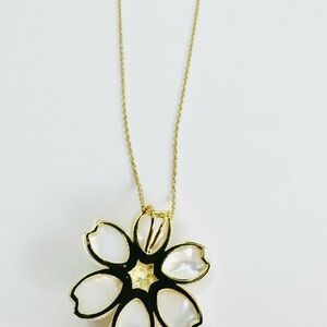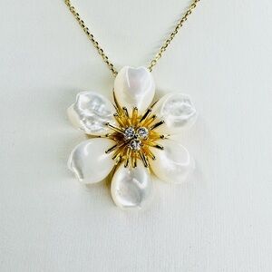 This exquisite necklace features White Mother of Pearl stunning floral pendant with white petals and a gold center. Perfect for adding a touch of elegance to any outfit.