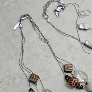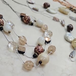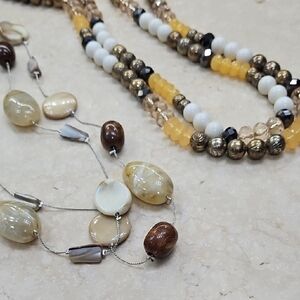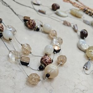 These 3 stunning necklace set features a blend of cream, brown, and gold beads, perfect for adding a touch of elegance to any outfit. Ideal for both casual and formal occasions.