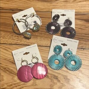 Discover a stunning set of earrings featuring EST 1946 vibrant pink, teal and brown tones. Plus round hoops with yellow crystals. Perfect for adding a pop of color to any outfit. All new with tags. Never worn. Please review photos for details. The pink earrings has a small chip on the back.