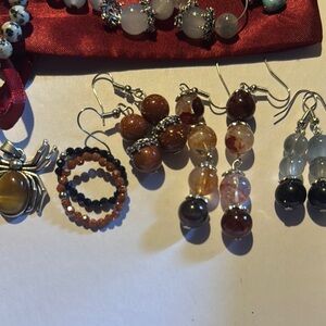 Discover the perfect accessory with this elegant multi-color earring set. Featuring a blend of gold, silver, and brown tones, these earrings add a touch of sophistication to any outfit. Ideal for any occasion. Mystery bag/jar of a Ring is a locket garden quartz, stretchy sandstone ring, larimar, Laborite, fire quartz earrings, with tiger eye spider pendant and more