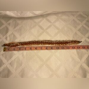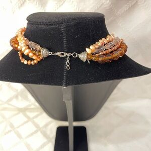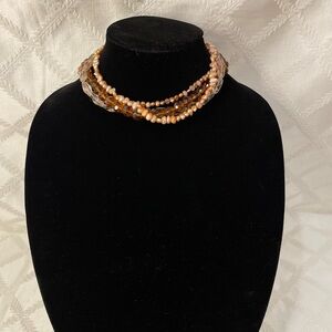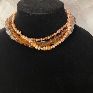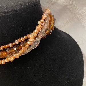 Chic multi-strand necklace with peach and amber tone beads. Perfect for adding a touch of elegance.