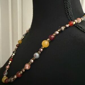 This exquisite necklace showcases a blend of vibrant beads in yellow, red, and brown hues. Perfect for adding elegance to any outfit.