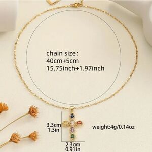This stunning necklace features a cross pendant adorned with multicolor gemstones set in a gold finish. Perfect for adding a touch of elegance to any outfit.