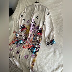 Gorgeous and elegant maxi dress featuring a vibrant multicolor design in shades of cream, purple, and blue. Crafted from a luxurious, silk-like fabric, this dress has a beautiful flow and a flattering fit. The button-down front is delicately covered for an extra touch of sophistication. Fits sizes Small and Medium comfortably. Perfect for making a statement at any occasion — stylish, unique, and incredibly comfortable.