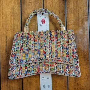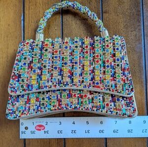 This stunning handbag features a vibrant multicolor beaded design on a gold background. It is the perfect size to hold exactly what you need for an elegant evening out. Comes with a gold toned chain for shoulder carry. Literally used only once.