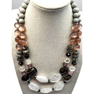 A beautiful combination of soft grey, blush, and earthy tones, this statement necklace features round beads and faceted stones. Its adjustable length ensures a comfortable fit, making it an ideal accessory for adding a touch of elegance to any outfit.