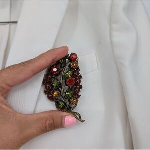 Add a touch of elegance with this stunning multicolor leaf brooch. Featuring vibrant red, green, and orange stones, this piece is perfect for any occasion.