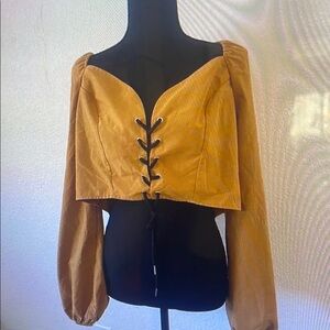 This stylish mustard top features a chic lace-up front and long sleeves, perfect for any occasion. Elevate your wardrobe with this versatile piece.
