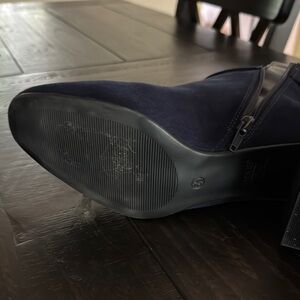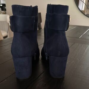 Step out in style with these elegant navy ankle boots, featuring a striking gold buckle. Perfect for any occasion, these boots offer both comfort and sophistication.