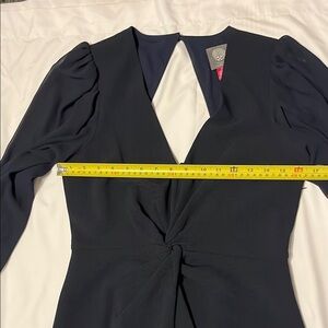 This elegant navy blue dress features a sophisticated design perfect for any occasion. The deep V-neck and long sleeves add a touch of class, making it a versatile addition to your wardrobe.