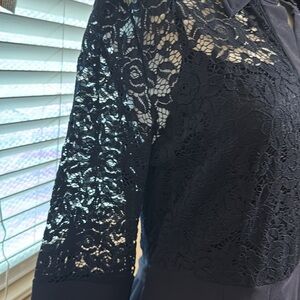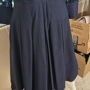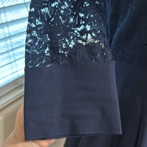 Elegant Navy Blue Dress With Lace Bodice And Sleeves
