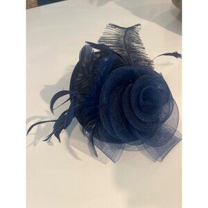 Elegant Navy Blue Fascinator Hat With Mesh Rose & Feather Accents For Weddings R