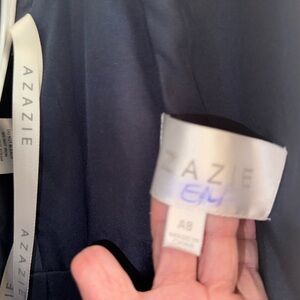 Stylish Azazie piece in a rich midnight blue. Ideal for elegant events. Has a mesh over the chest that comes up like a crew neck, and goes into a deep V down to the bottom of your breast. (It is not itchy.). Also has a front leg slit for style.