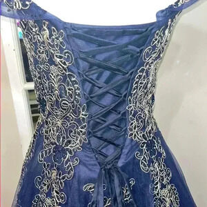 Stunning navy blue gown. Features intricate gold embroidery. Perfect for formal events.