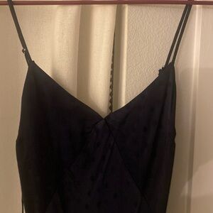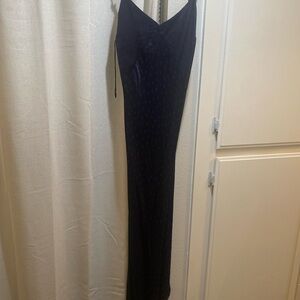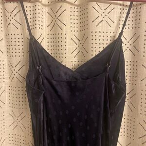 Chuc navy blue dress with asymmetrical bottom hem. The color is a dark navy blue with blue polka dots. So cute for a wedding guest or formal event. Only worn one time, purchased at high end boutique