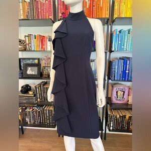 This elegant navy blue dress features a stylish ruffle design, perfect for any business or date night occasion. Its sophisticated look makes it a must-have addition to your wardrobe. Layflat Measurements: pit to pit 16”, waist 13.5”. Size 4