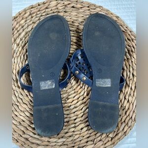 Elegant Navy Blue Sandals with Decorative Medallion. Size 9.