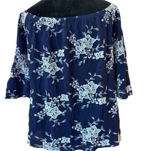 Step out in style with this elegant navy off-shoulder blouse, adorned with a charming floral pattern. Perfect for adding a touch of sophistication to your wardrobe.