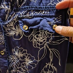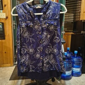 This elegant sleeveless blouse features a beautiful floral design in navy. Perfect for both casual and business occasions.
