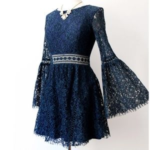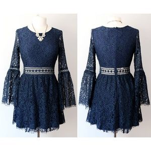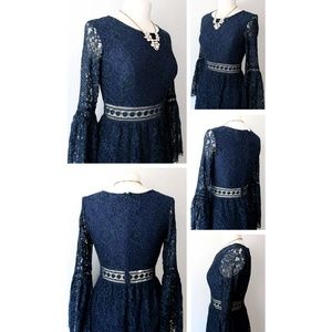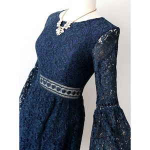 This elegant navy lace dress features intricate detailing and flared sleeves, perfect for any special occasion.