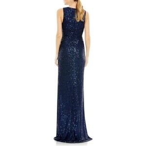 Shimmer in this stunning navy sequin gown, perfect for any special occasion. The elegant design features a flattering silhouette and a daring slit for added allure.