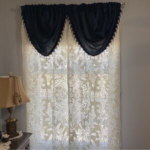 Enhance your home with these elegant navy and cream lace curtains. Perfect for adding a touch of sophistication to any room.