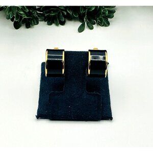 Sophisticated wide-band clip earrings designed with a sleek navy enamel exterior and luxurious gold-tone interior. Precision-crafted with a modern architectural silhouette, these earrings offer a bold yet refined accessory for professional and evening wear.