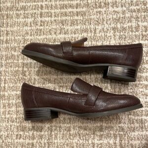 These new brown leather Nine West flats feature a sleek pointed toe and a stylish strap across the vamp, offering a sophisticated look. The textured leather finish adds a touch of elegance, while the low heel ensures comfort for all-day wear. Perfect for both casual and formal occasions, these loafers are a versatile addition to any wardrobe. Never worn.