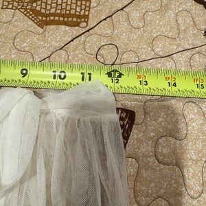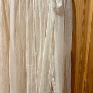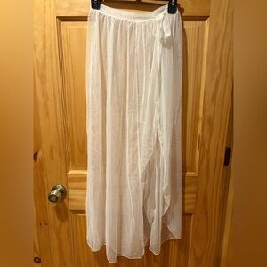 Questions and comments, please. Measurements and pictures. This elegant off white sheer skirt is perfect for a light cover up for pool, beach etc. Its flowing design adds a touch of sophistication to your swim suit. No label. Good condition women’s size L