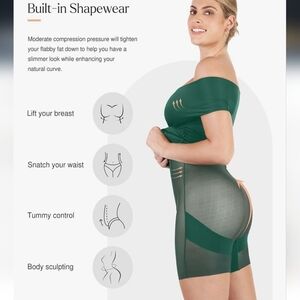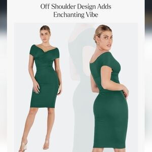 This elegant off-shoulder dress features a stunning green hue and built-inshapewear, perfect for any occasion. Its sleek design offers a flattering fit, making it a must-have addition to your wardrobe. NWT AND IN EXCELLENT CONDITION!