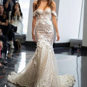 This beautiful wedding gown is from the Berta Couture Napoli collection style 20-101. I fell in love with this particular Berta style because of how stunning the sparkle is! It dazzled brilliantly with flash photography and at night under the reception lights!I Photos don’t quite do it justice. I also loved the illusion lace corset back, sexy off the shoulder straps, and dramatic train. The elastic straps can be worn on or off the shoulder.