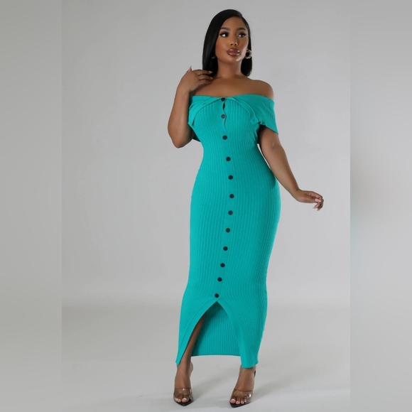 Step out in style with this elegant off-shoulder teal dress. Perfect for any occasion, this dress features a flattering fit and button details. A must-have addition to your wardrobe.