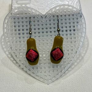 Add a touch of elegance with these olive and magenta dichroic glass earrings. Perfect for any occasion.