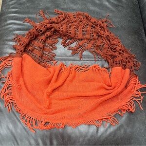 Add a pop of color to your outfit with this elegant orange fringed infinity scarf. Perfect for any occasion. 100% Acrylic