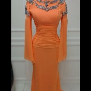 Modest gown. Step into elegance with this stunning orange long sleeve dress, adorned with exquisite silver detailing. Ideal for any special event.