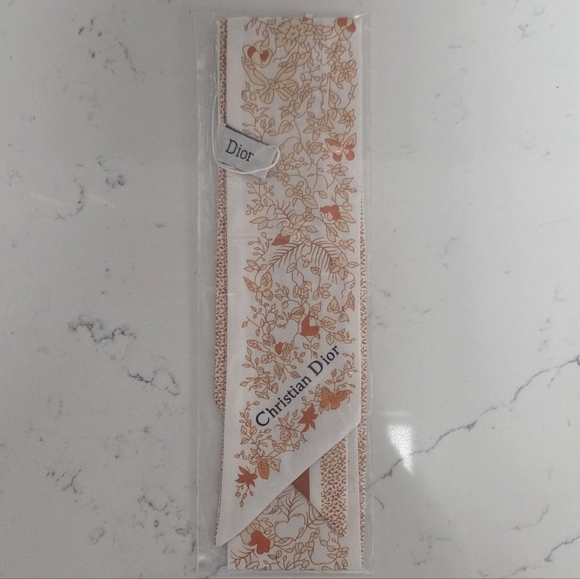 Elegant scarf design. Features butterflies and floral in orange and white colors. Perfect for adding a touch of luxury.