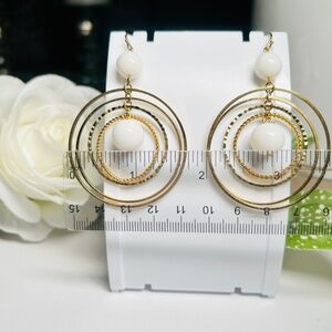 This elegant pair of earrings has four concentric circles each aligned to perfection that orbit the beautiful white acrylic beads on these dangle drop earrings.