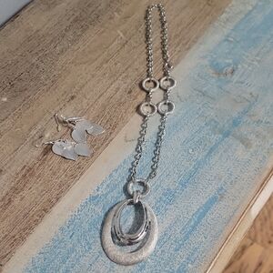 This elegant silver tone 3 tier oval necklace and earring set adds a touch of sophistication to any outfit. Perfect for any occasion. No markings