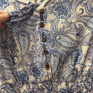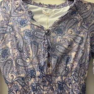 Step out in style with this elegant paisley print dress. Featuring a beautiful blend of blue and pink, this dress is perfect for any occasion. 5 button closures on the chest. The long sleeves and flowing design add a touch of sophistication to your wardrobe. Women’s size medium from SunnySpirit. New with tag.