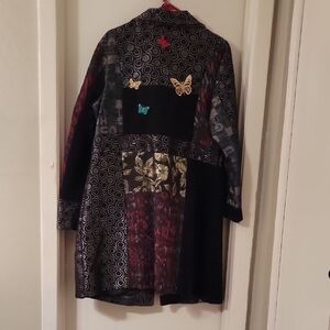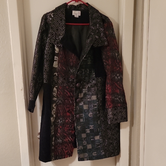 Elevate your wardrobe with this elegant multicolor patchwork mixed media coat. Featuring a unique blend of corduroy black, red, and gold tones, this coat is perfect for making a stylish statement! No signs of wear and tear. Never worn.